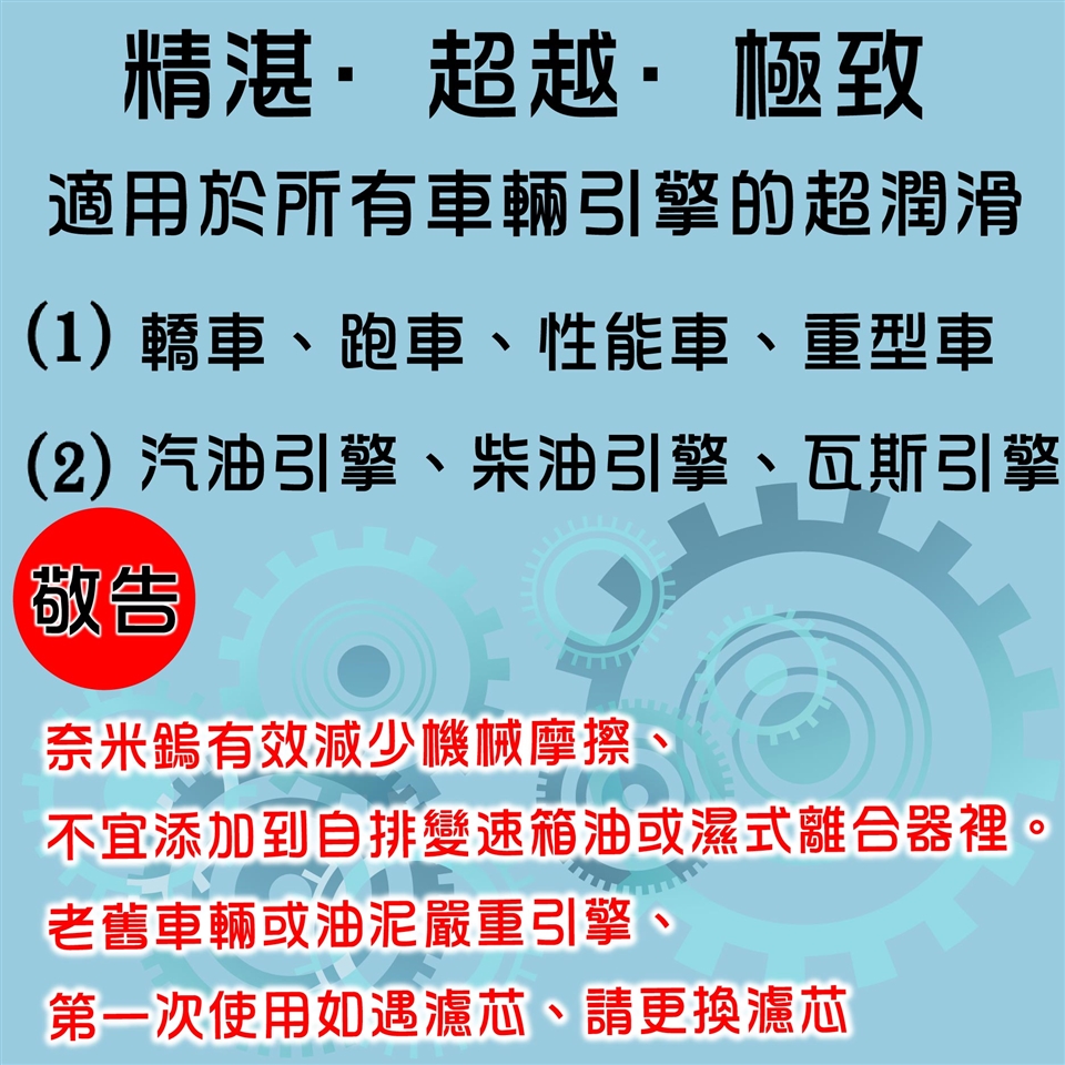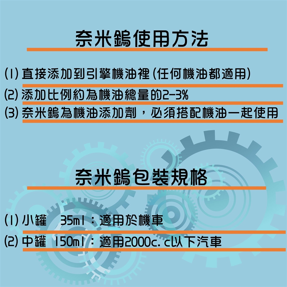 例如:10公升機油添加300ml奈米鎢