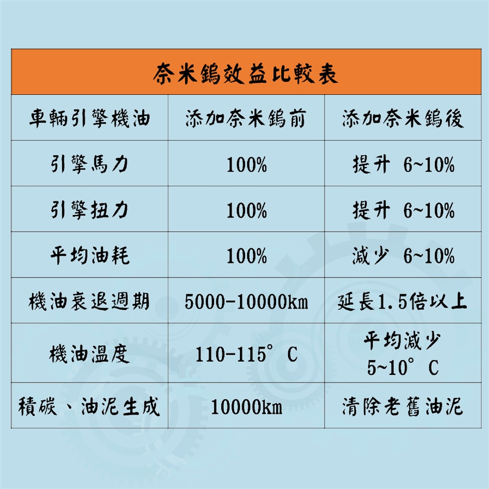 1、抗磨:奈米鎢分子減少摩擦,有效保護引擎。