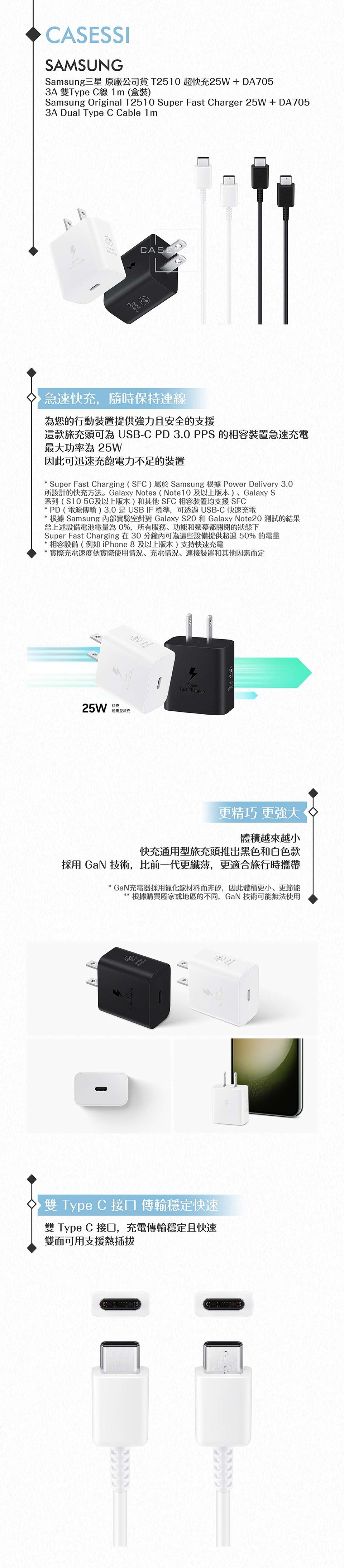 商品名稱:T2510 超快充25W + DA705 3A 雙Type C線 1m
