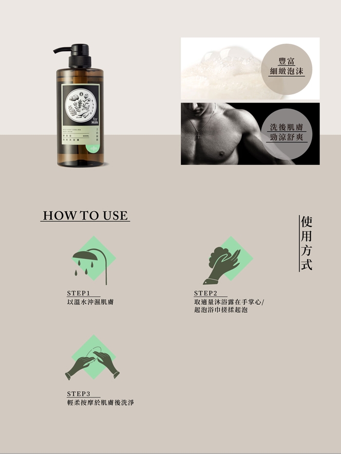 用法:取適量置於海綿或掌心,按摩潔淨全身後再以清水沖淨。