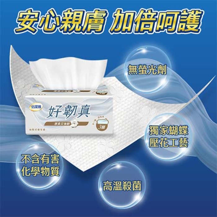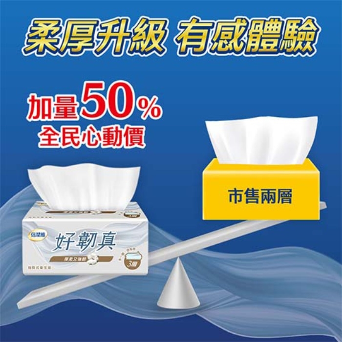 ★三層抽取式衛生紙,拉力韌度升級,多一層厚柔,多一道安心