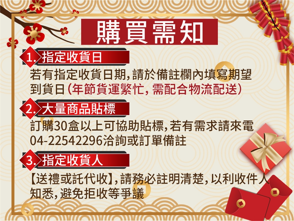 同品項30盒以上,可提供標籤代貼服務,下單前請來電告知標籤文字內容,廠商電話04-22542296 (僅限標籤服務)。