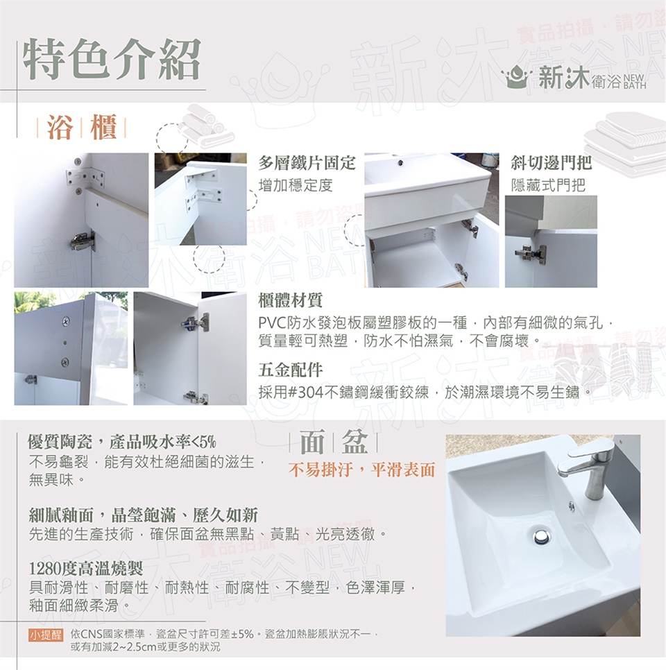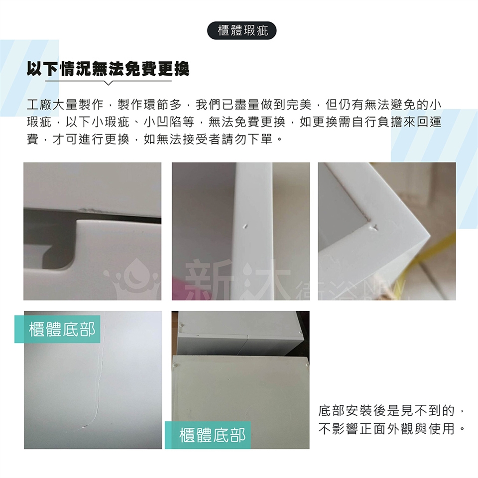 ◎浴櫃內部請保持乾燥,因潮濕造成櫃內起水泡或五金生鏽,本公司將不負責保固及售後服務。
