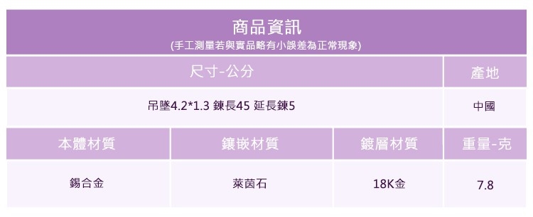◆合金飾品一經使用可能隨時間失去光澤或褪色,此為正常物理現象,妥善使用保存可延長飾品壽命。