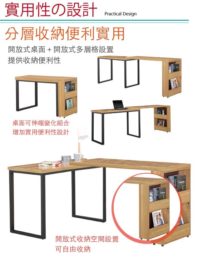 採用可伸縮多變書桌組合+開放式層格等收納設計