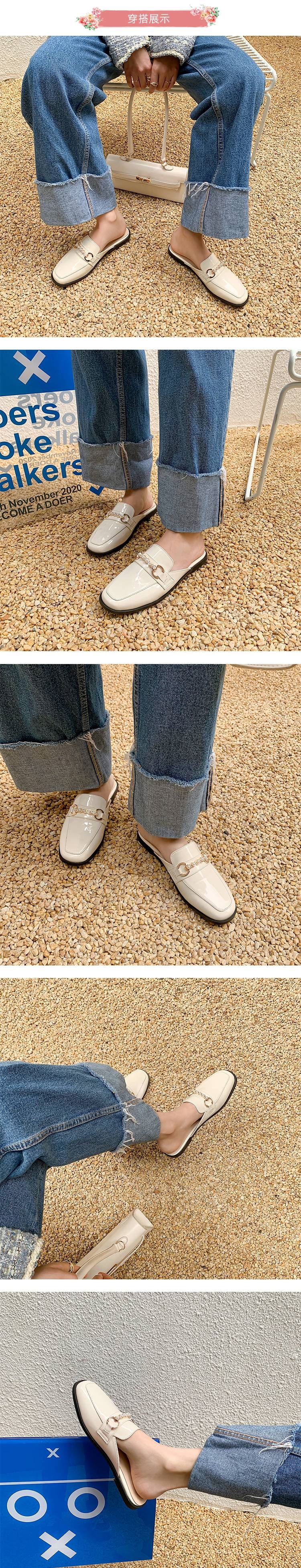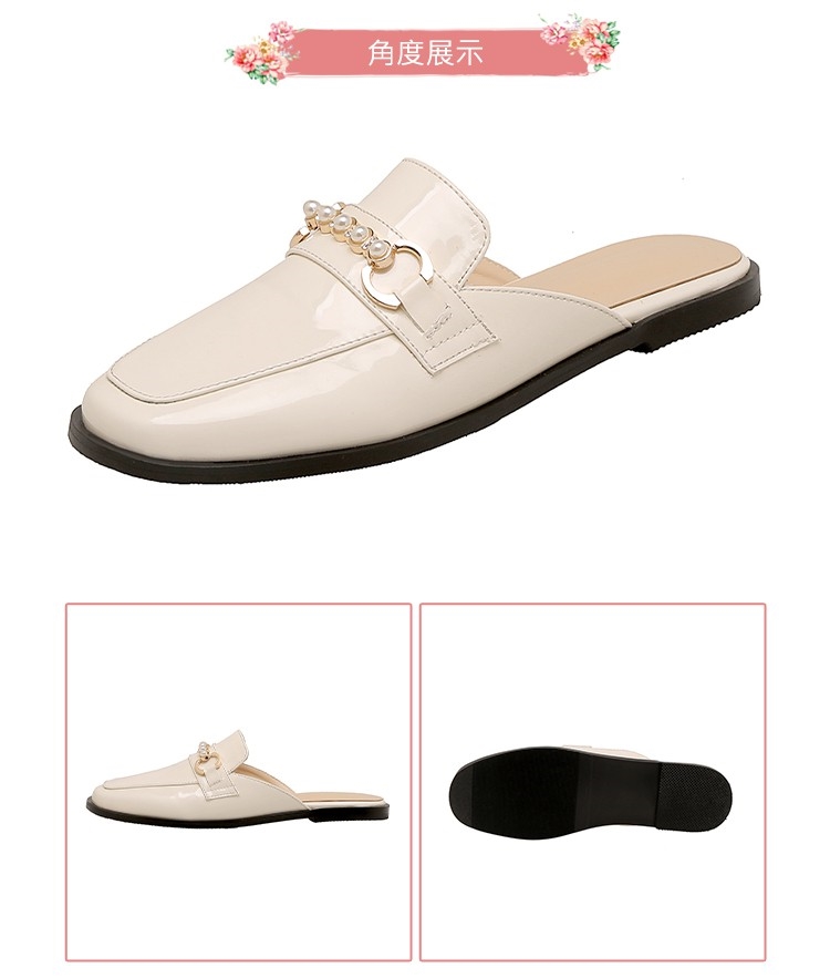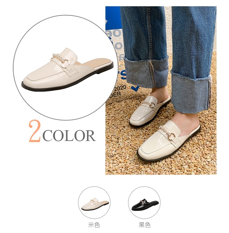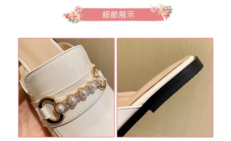 【Kissxxx】粗跟穆勒鞋低跟穆勒鞋/百搭復古亮漆皮珍珠釦包頭低跟穆勒鞋 米
