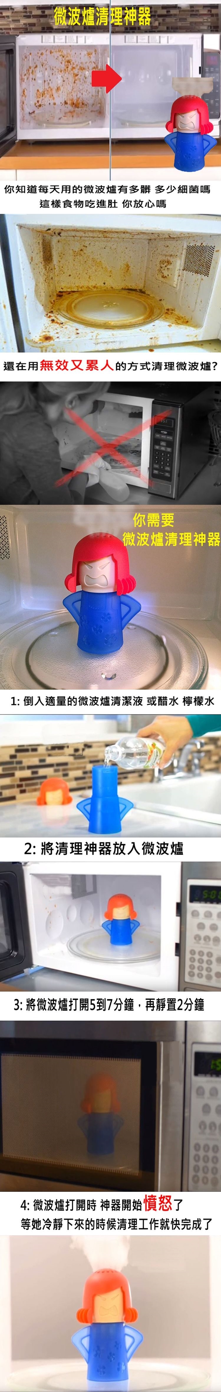 微波爐清理神器是每一個家庭必備的清潔工具。微波爐太髒了,神器怒火衝天,它要使用自己的“怒氣”將微波爐清洗乾淨,長期的使用微波爐各種食物噴灑在微波爐壁上,乾結粘在壁上,極不易清洗,波爐清潔器是採用蒸汽霧化的原理將乾結物軟化後清潔。  使用方法:首先將清理神器頭部的蓋子打開,然後加入適量的醋和水,還可以加一些檸檬汁去異味,其後將微波爐打開5~7分鐘,再靜置2分鐘,待神器冷卻後取出,最後取一塊乾淨的抹布輕鬆的將微波爐擦乾淨