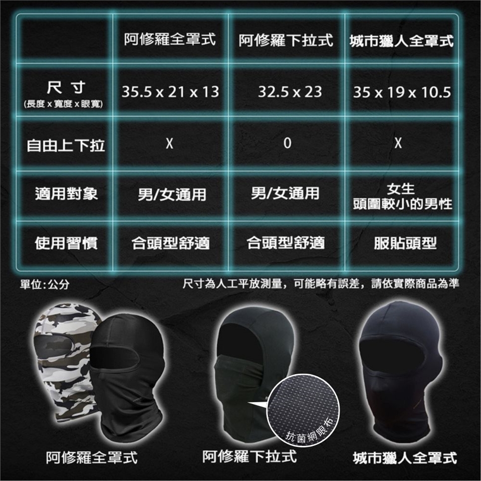 網狀下拉式頭套則是具備了能完全上掀及下拉的功能,在接聽電話或喝水時更加方便,並且於口罩部分採用網狀布料,使呼吸更透氣順暢。