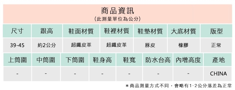 2.鞋類商品依功能及用途之不同,鞋底各有其止滑係數之個別不同,使用鞋類商品請用於正常平坦之路面,非雨鞋或雨靴類商品,請避免穿著於下雨濕滑路面上行走。