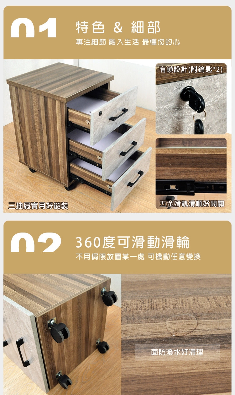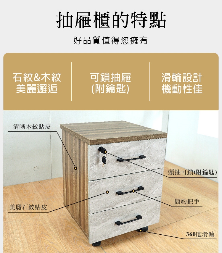 ★活動櫃三抽式超大空間還有隱密加鎖、抽屜滾珠滑軌滑動順暢並有可全卸式開關、活動萬向滑輪可輕鬆移動櫃體