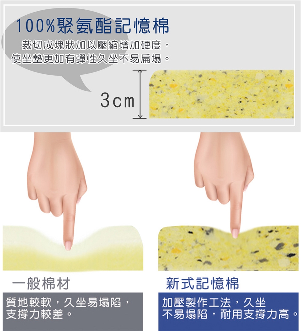 《CHIBA》紙纖記憶型坐墊,採高品質記憶惰性聚合泡棉,耐久不易變形。能有效分散身體的重量,久坐依然舒適。