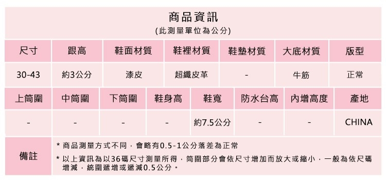 2.鞋類商品依功能及用途之不同,鞋底各有其止滑係數之個別不同,使用鞋類商品請用於正常平坦之路面,非雨鞋或雨靴類商品,請避免穿著於下雨濕滑路面上行走。