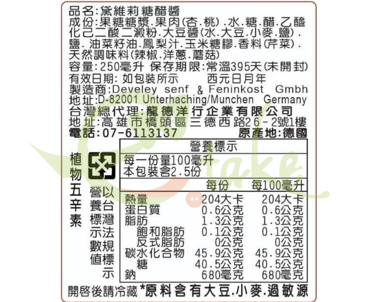 素食(植物五辛素),原料含有豆類.小麥過敏源,開啟後請冷藏.