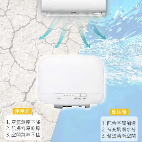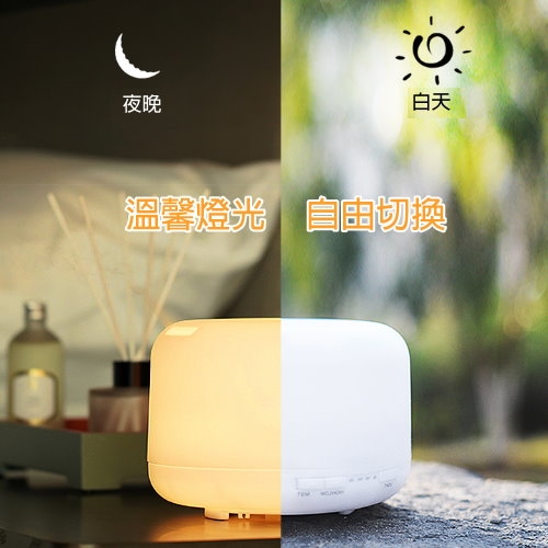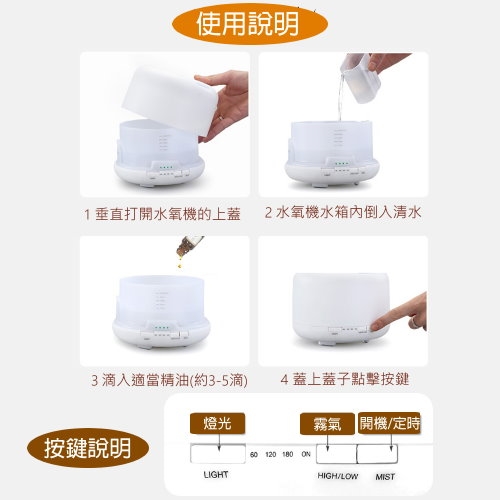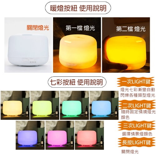 【產品參數】    ★電源:AC 100-240V DC:24V 650MA    ★材料: 進口環保PP料    ★超聲波頻率: 2.4MHZ    ★水箱容量: 500ML    ★燈光模式: 彩光款: 七彩漸變, 切換固定顏色, 關閉 暖光款: 半亮, 全亮, 關閉    ★加濕量: 50ml-70ml/小時    ★定時功能: 支持 1h/2h/3h/連續噴霧可達10小時 ★缺水斷電: 支持    ★時間: 最長運行10小時    ★適用面積: 香薰10坪 加濕6-7坪    ★LED燈: 彩燈(紅綠黃藍紫青白)/暖燈(暖白)