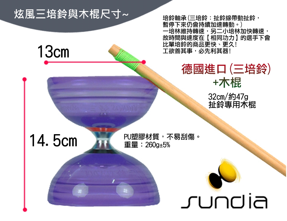 本商品品質除了安全、耐用之外,整個扯鈴的平衡是否穏定則是來自於軸承的部份!具有很大影響!採用德國進口專利軸承培鈴~讓您的扯鈴就是比別人高一等!