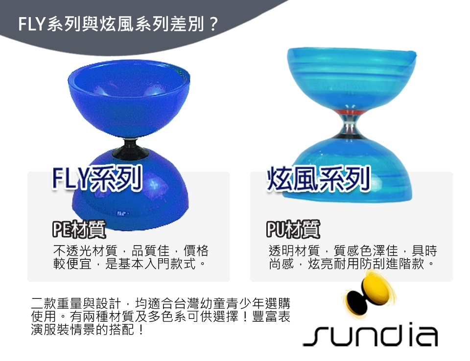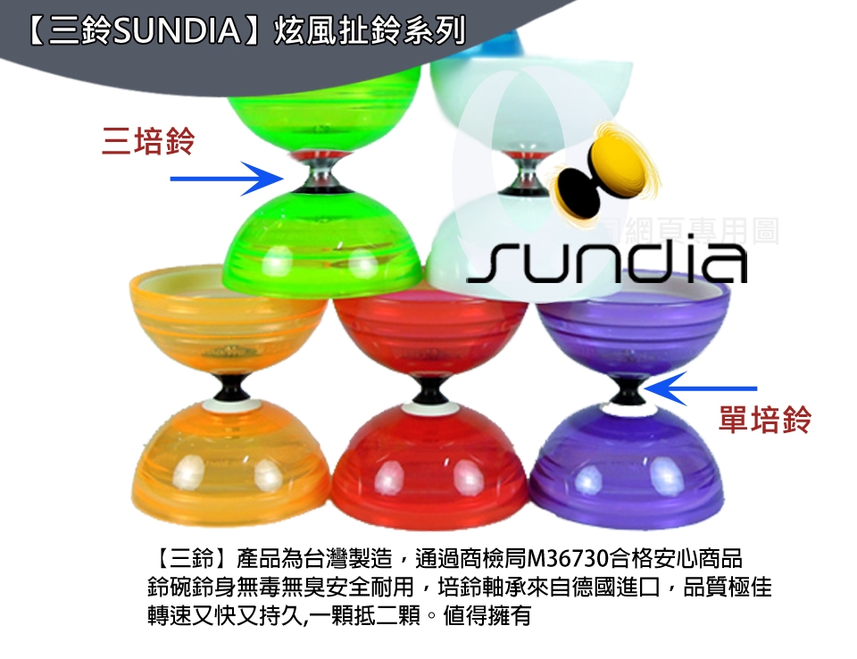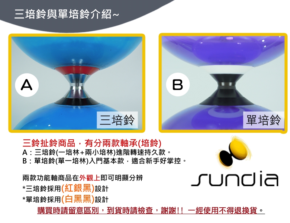 一般來說,單培鈴與三培鈴,在使用上就是會有加速持久的差異!一般市面上傳統的定軸鈴是無法作到的喔!所以您一生中一定要有的培鈴商品。就在三鈴SUNDIA專業扯鈴系列商品館!