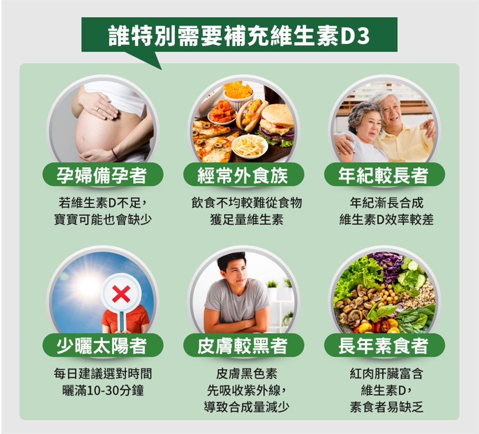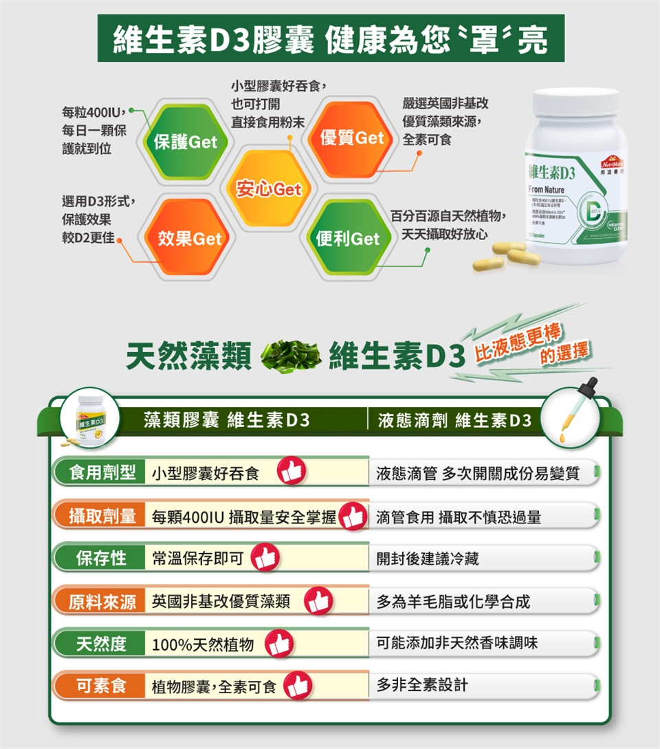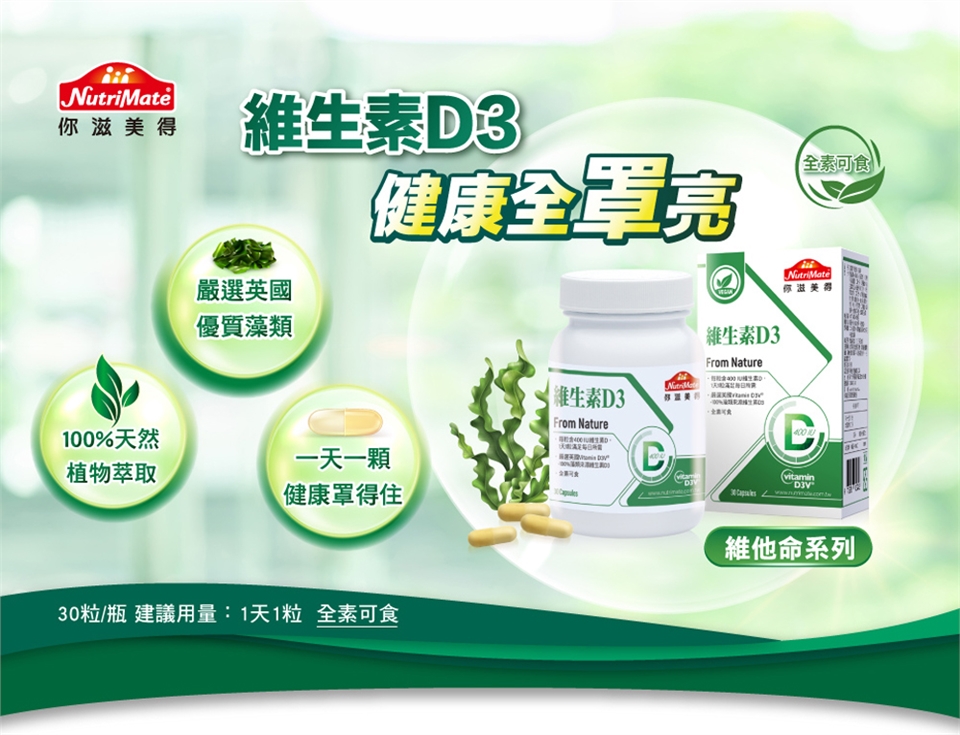 維生素D已躍身成為全球最夯的明星營養素,維生素D3效力較D2更佳,更是全民健康保養的熱門必備,特別是長年素食者、以及高齡族、孕/產婦/哺乳者、外食族易不足更特別加強補充!維生素D3好處多,除了能夠促進鈣吸收、促進釋放骨鈣維持血鈣平衡,維生素D3功效更像是身體總司令,更為您自然身體保護罩,維他命D3推薦100%植物性膠囊的「你滋美得維生素D3」,嚴選優質英國藻類來源,一天一顆,健康為你"罩"亮!