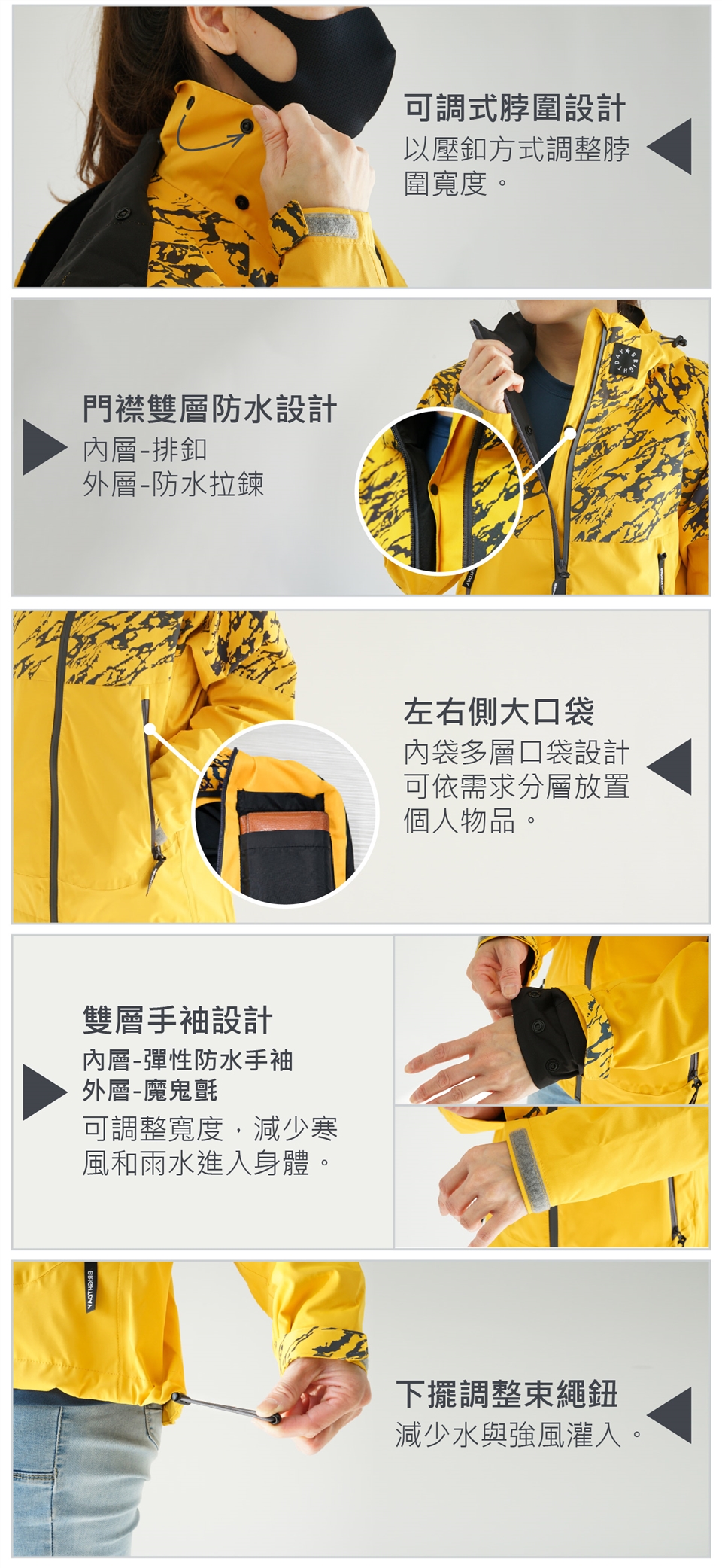 雨衣穿著時,請務必將拉鍊/扣子正確拉/扣上,並配戴雨帽,避免漏水