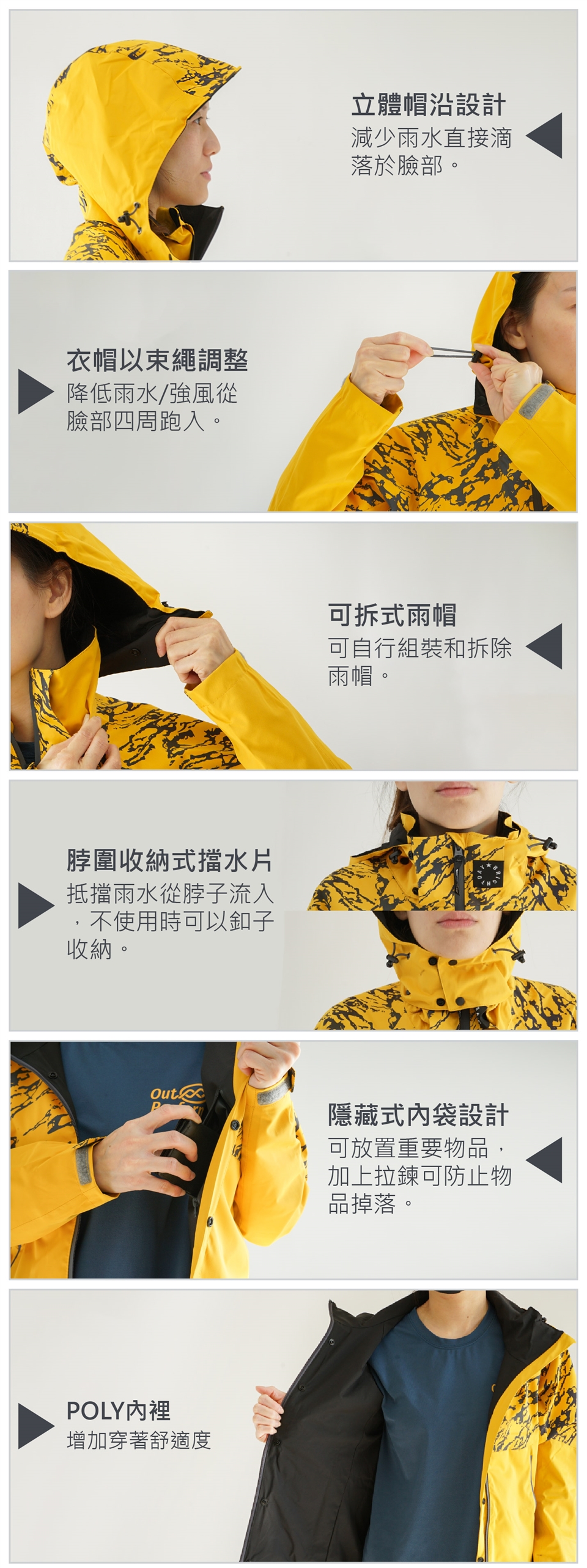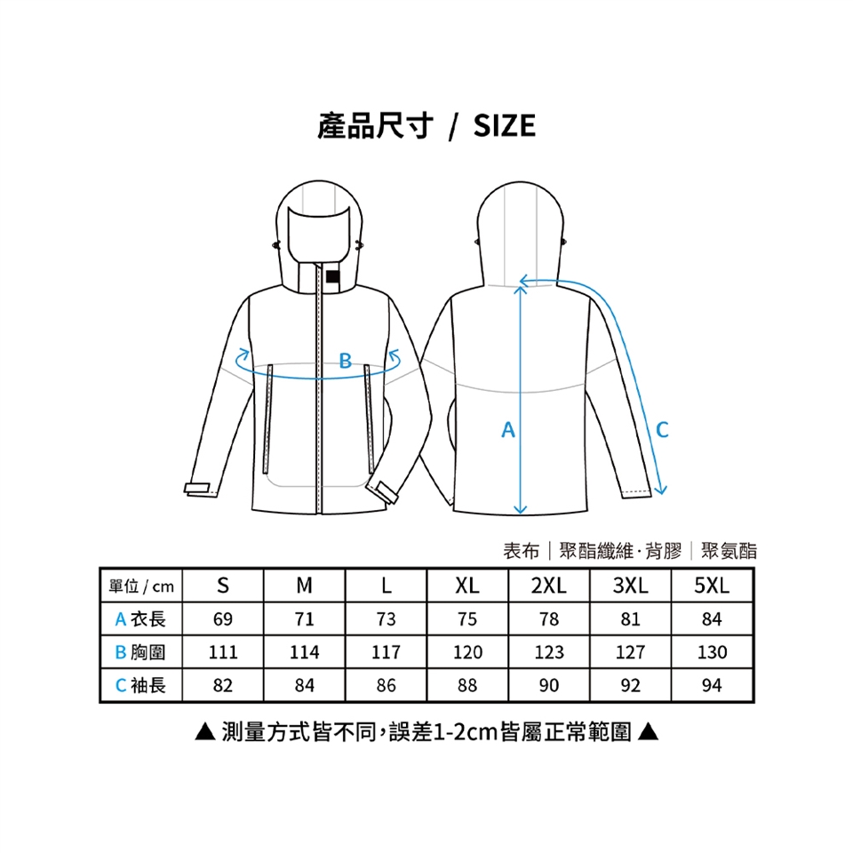 雨衣穿著時,請務必將拉鍊/扣子正確拉/扣上,並配戴雨帽,避免漏水