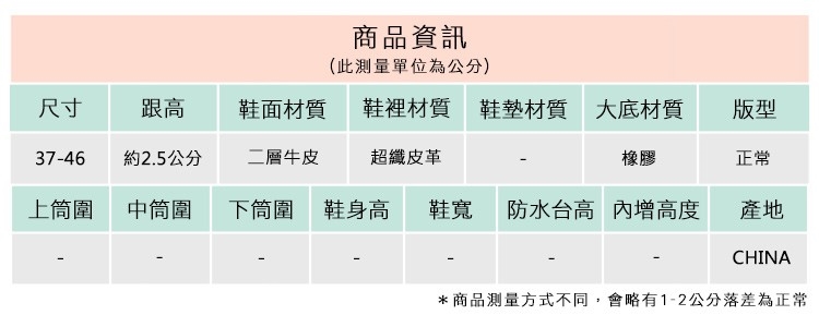 2.鞋類商品依功能及用途之不同,鞋底各有其止滑係數之個別不同,使用鞋類商品請用於正常平坦之路面,非雨鞋或雨靴類商品,請避免穿著於下雨濕滑路面上行走。