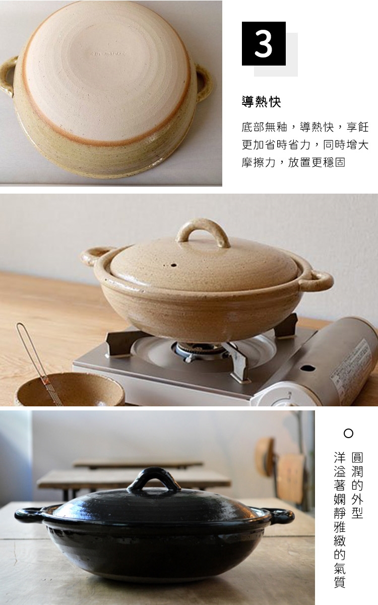 12.鍋子應於小火開始加熱,若在冷卻的狀況下突然以大火加熱,底部接觸火源的地方容易因為溫差過大而裂開。