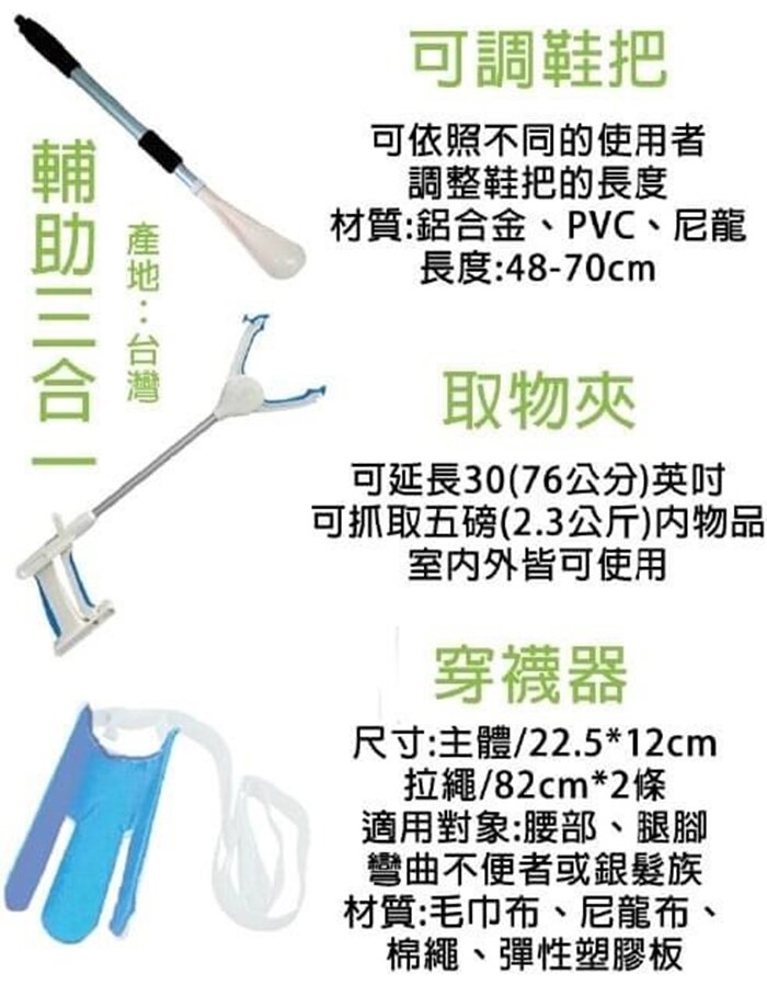 - 取物夾&鞋把:鋁合金、PVC、尼龍