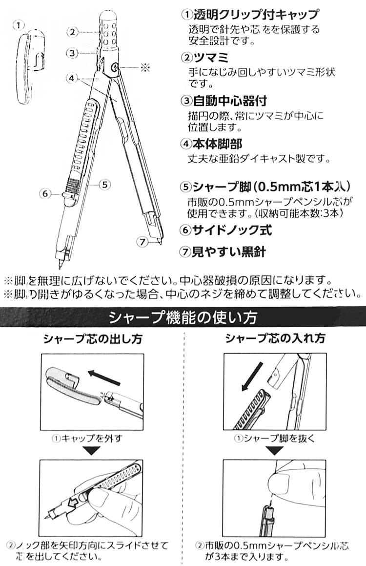 ● 重擊可能使圓規斷裂,請小心不要讓工具掉落。