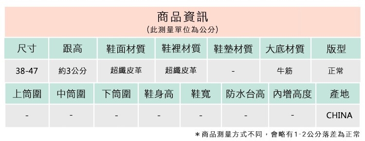 2.鞋類商品依功能及用途之不同,鞋底各有其止滑係數之個別不同,使用鞋類商品請用於正常平坦之路面,非雨鞋或雨靴類商品,請避免穿著於下雨濕滑路面上行走。