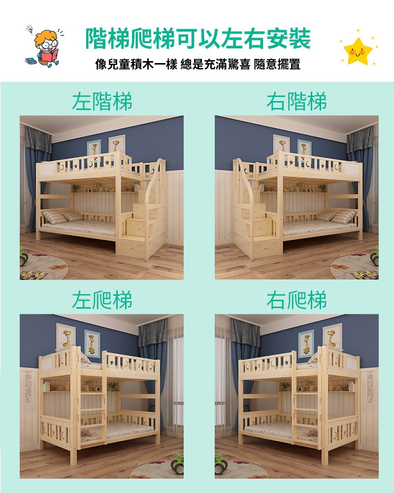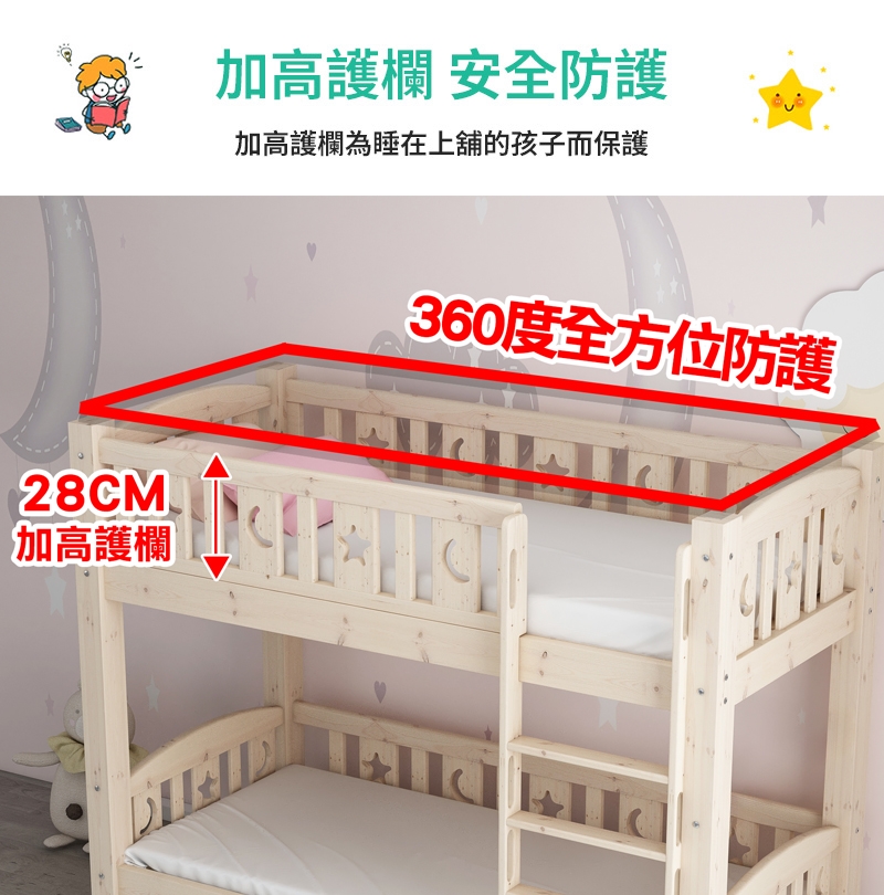 安全可靠:採用歐盟最高兒童家具專用木材等級SF級製成,堅固耐用,無毒無害,給孩子一個安全健康的睡眠環境。
