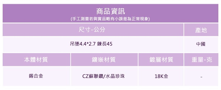 ◆合金飾品一經使用可能隨時間失去光澤或褪色,此為正常物理現象,妥善使用保存可延長飾品壽命。