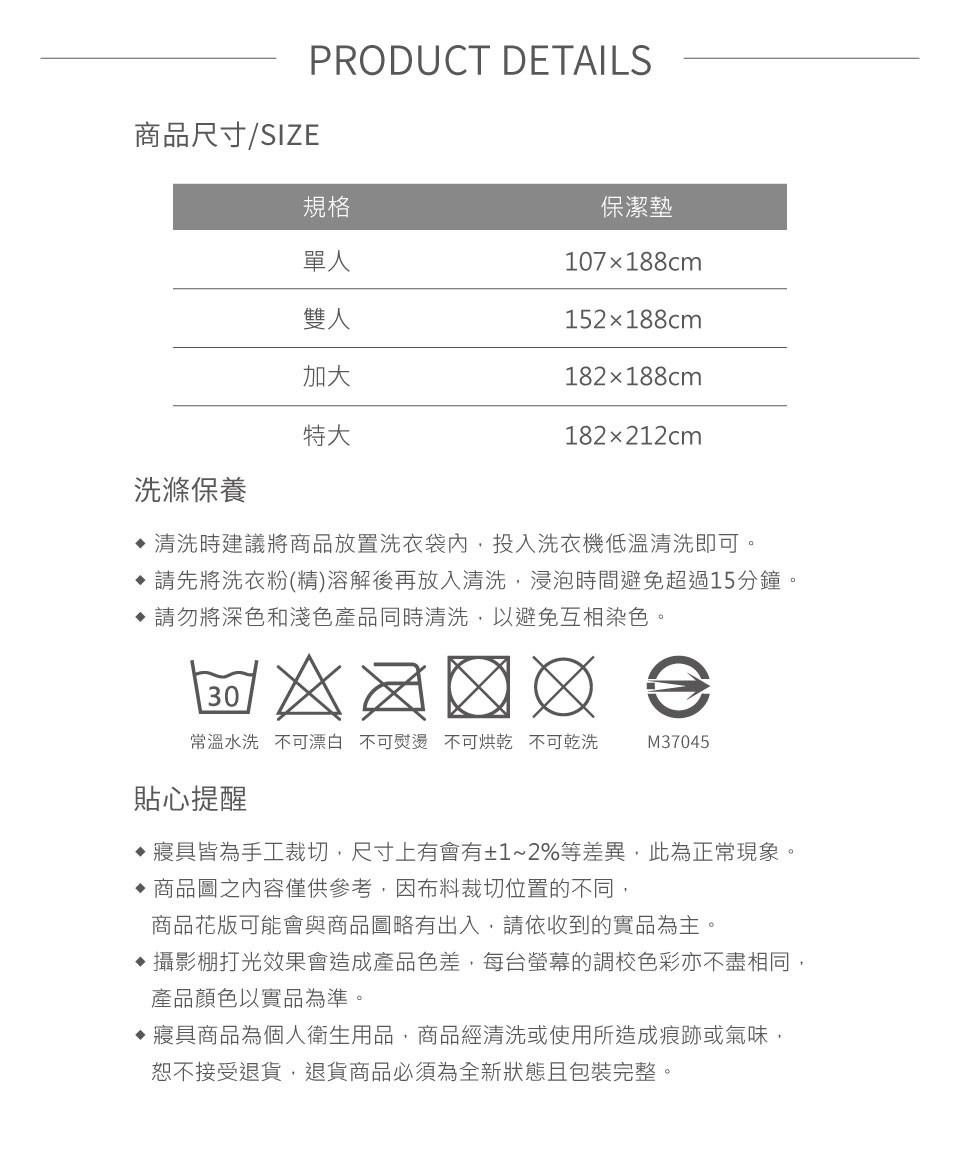 ◆清潔保養方式:可水洗/不可烘乾/不可漂白/不可乾洗/勿使用強力漂白清潔劑/浸泡時間請勿超過15分鐘/建議可放入大型.洗衣袋後再清洗(因深色布料請勿使用含漂白劑之洗劑,盡量避免浸泡,深淺色寢具請分開清洗)