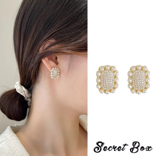 【SECRET BOX】韓國設計925銀針滿鑽珍珠綴邊造型耳環