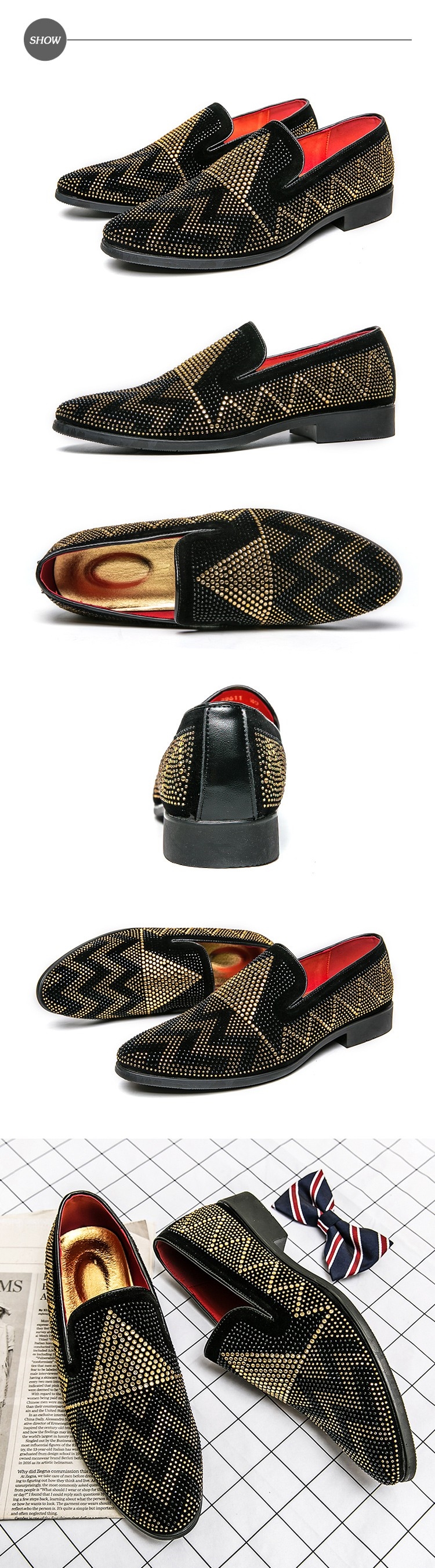 【Kiron】絨面樂福鞋粗跟樂福鞋/典雅絨面幾何波浪拼貼亮鑽潮流樂福鞋-男鞋 黑