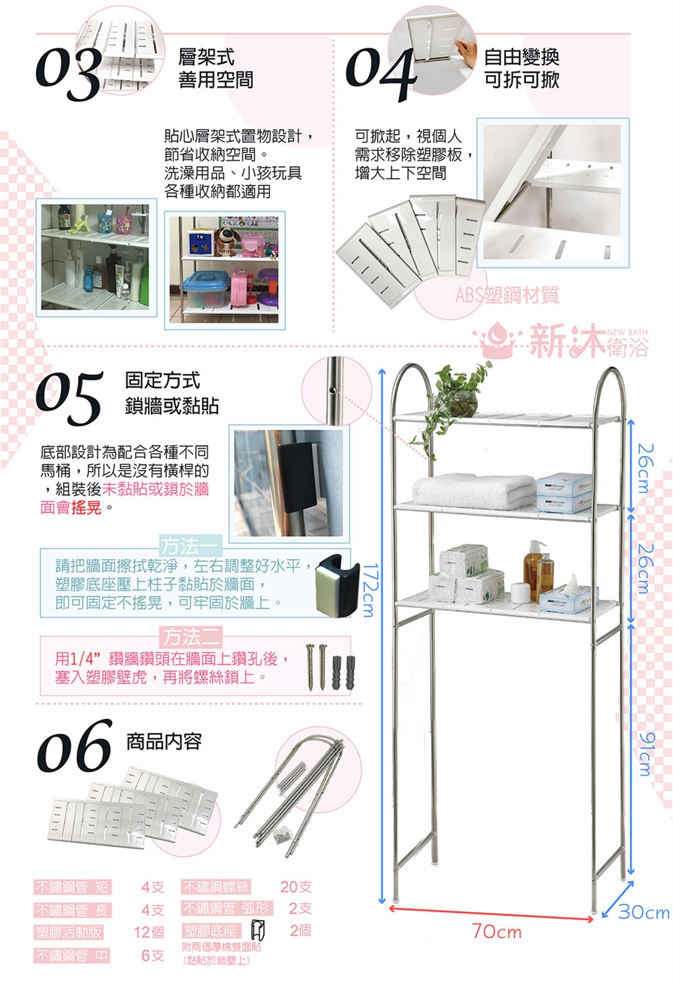 上層有附固定牆之塑膠底座,請把牆面擦拭乾淨,左右調整好水平,塑膠底座壓上柱子黏貼於牆面,即可固定不搖晃,可牢固於牆上。