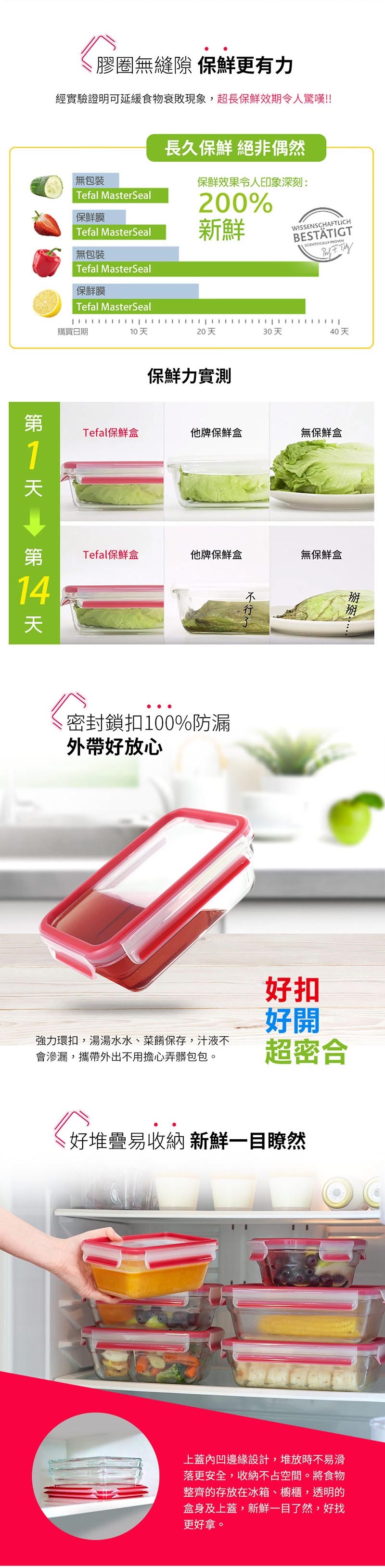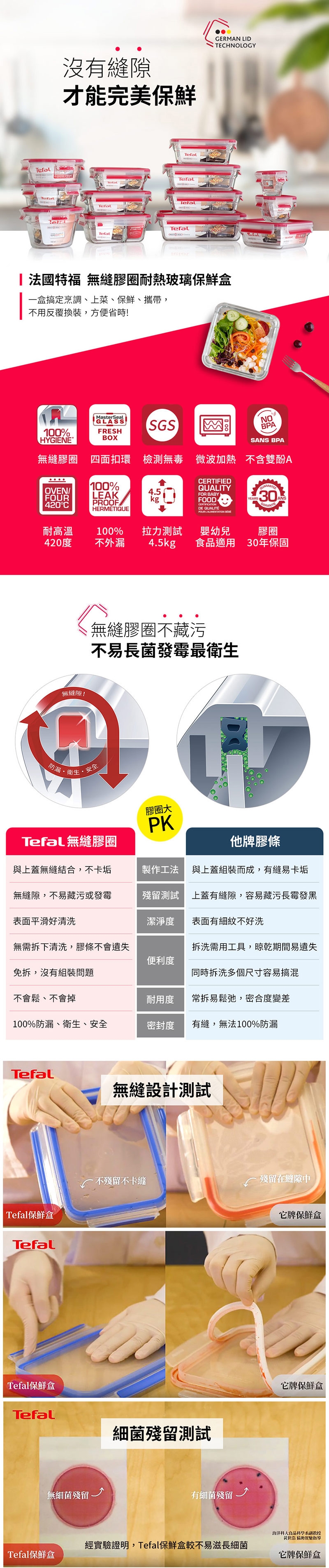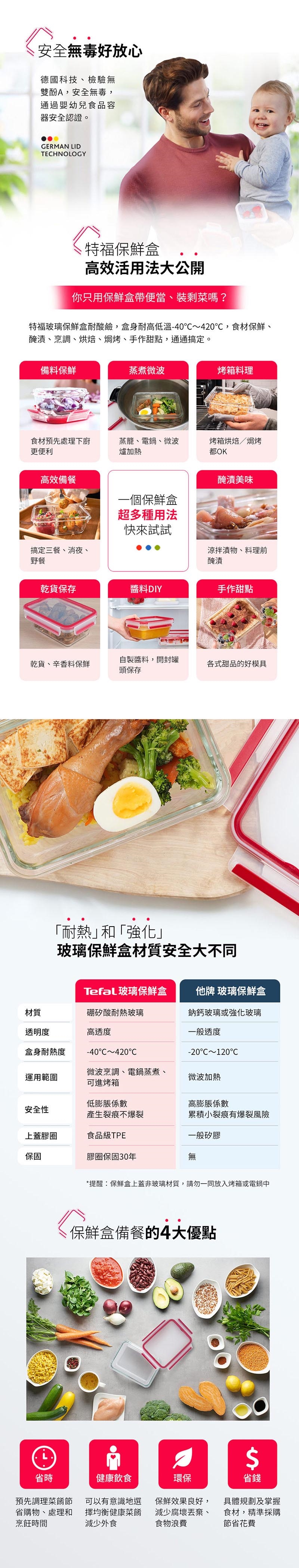 特福玻璃保鮮盒耐酸鹼,盒身為硼矽酸耐熱玻璃,耐高低溫-40°C~420°C,食材保鮮、醃漬、烹調、烘焙、焗烤、手作甜點,通通搞定。晶透玻璃美觀大方,一盒搞定烹調、上菜、保鮮、攜帶,不用反覆換裝,方便省時!