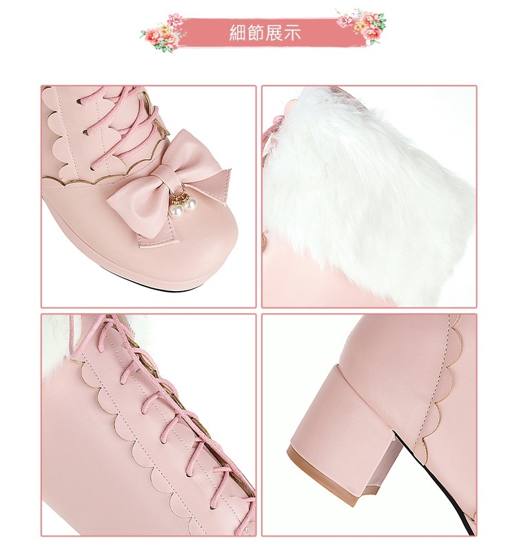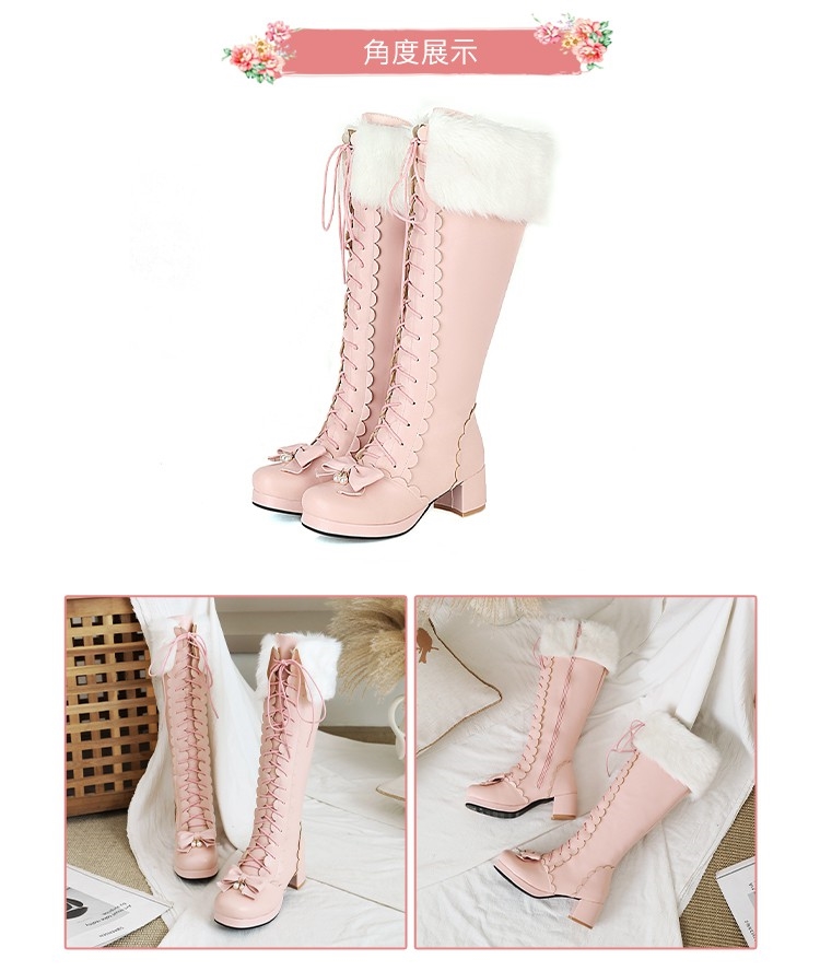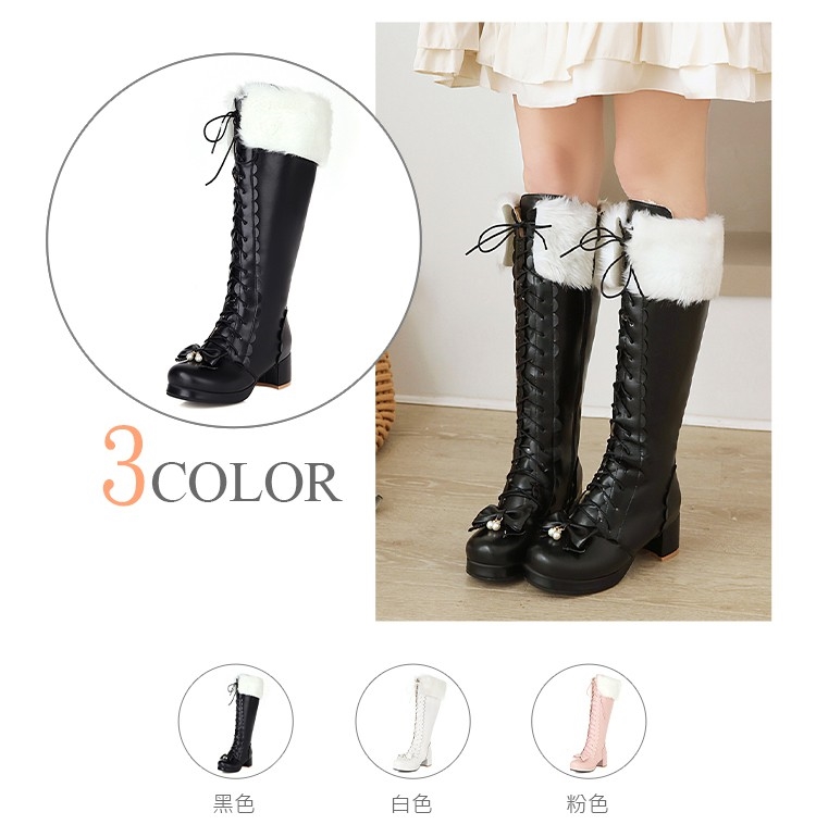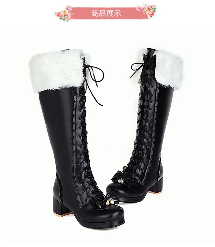【Kissxxx】蕾絲長靴粗跟長靴/甜美蕾絲花邊毛絨靴口系帶造型粗跟長靴 黑