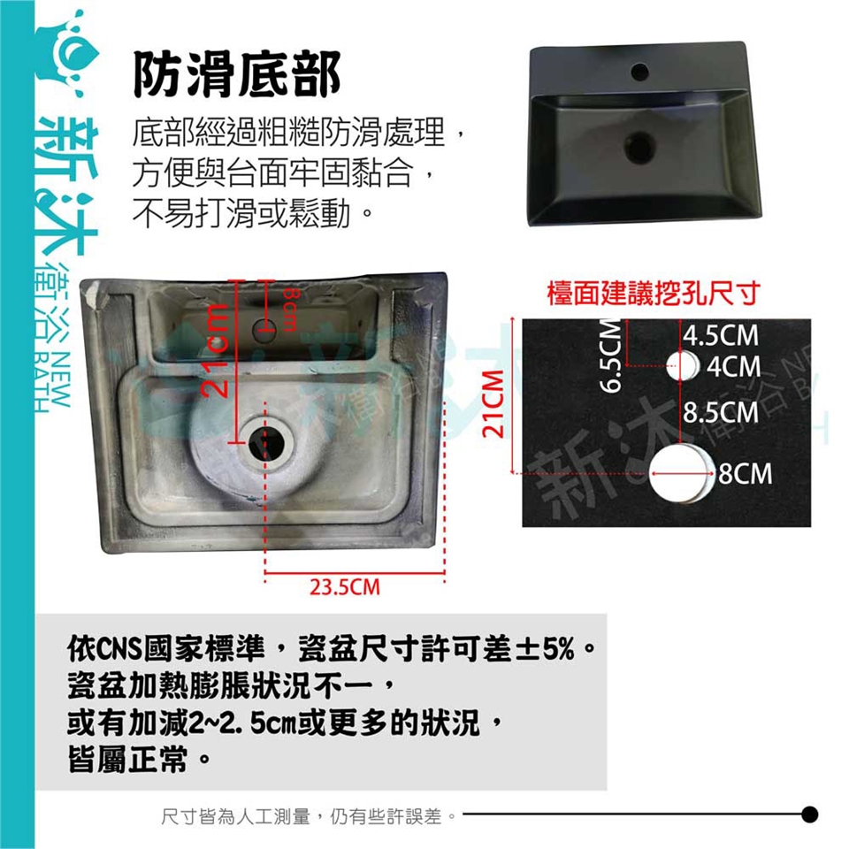 ◎依CNS國家標準,瓷盆尺寸許可差±5%。瓷盆加熱膨脹狀況不一,或有加減2~2.5cm。