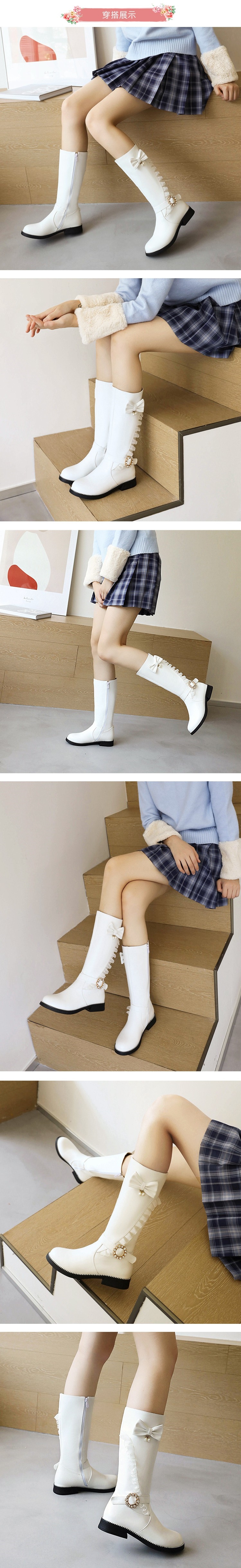 【Kissxxx】蝴蝶結中筒靴低跟中筒靴/唯美蕾絲蝴蝶結搭釦造型低跟中筒靴 白