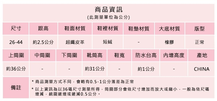 2.鞋類商品依功能及用途之不同,鞋底各有其止滑係數之個別不同,使用鞋類商品請用於正常平坦之路面,非雨鞋或雨靴類商品,請避免穿著於下雨濕滑路面上行走。
