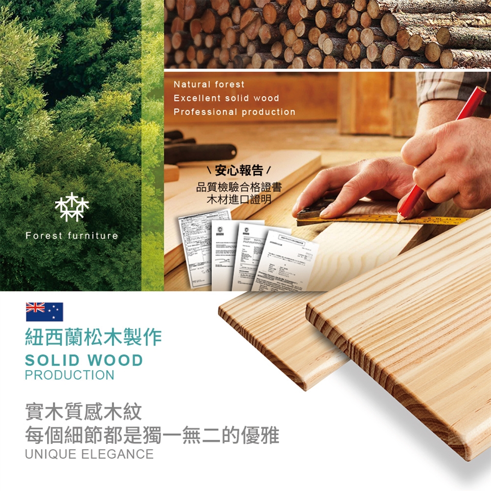 嚴選紐西蘭松木,100%真材實料,自然本色的溫暖木紋!