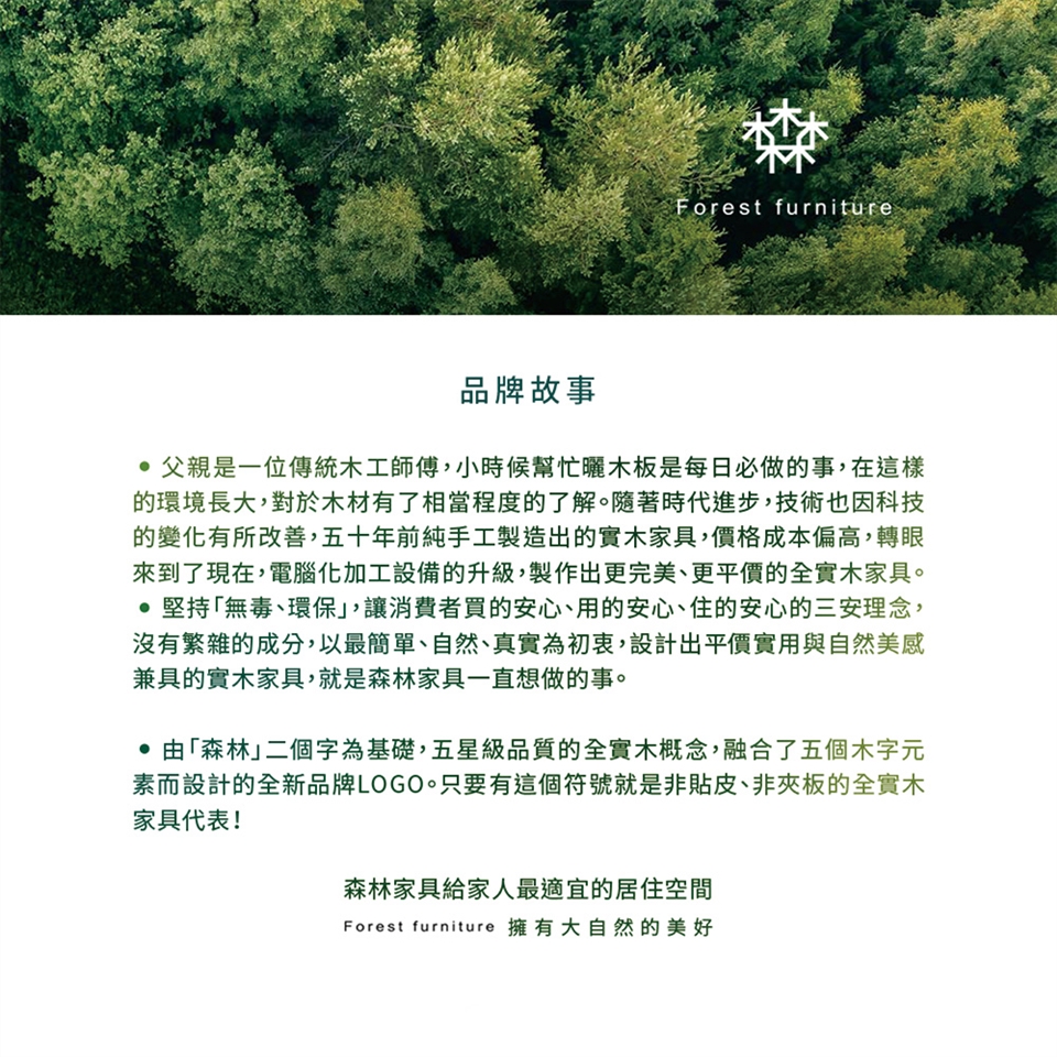 堅持「無毒、環保」,讓消費者買的安心、用的安心、住的安心的三安理念,沒有繁雜的成份,以最簡單、自然、真實為初衷,設計出平價實用與自然美感兼具的全實木家具,就是森林家具一直想做的事。