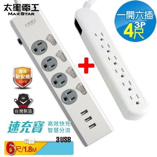 【買一送一】太星電工 3.5A 3USB四開四插電腦線/3P(6尺)+一開六插延長線(3P15A4尺)