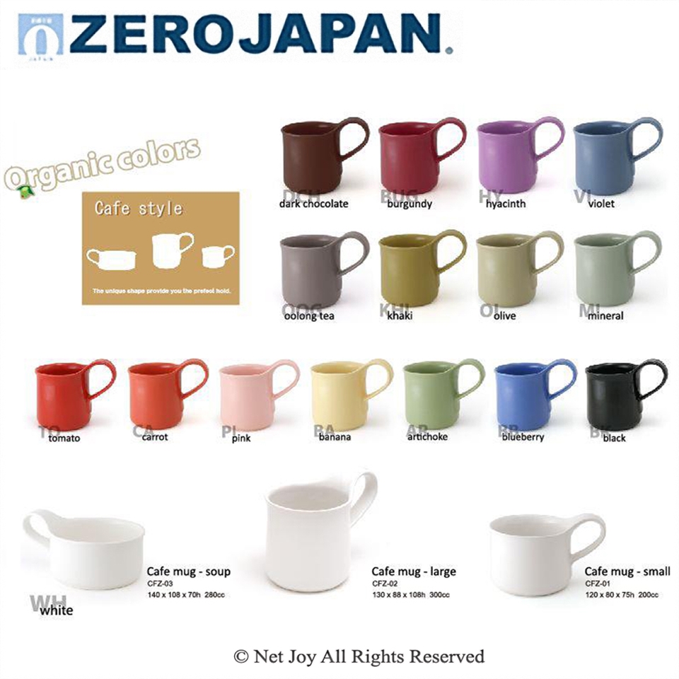 「ZERO JAPAN」為世界知名品牌之一,風行全球。「ZERO JAPAN」茶壺和杯子是100%日本製造,「ZERO JAPAN是日本最大的茶壺和茶具製造商。他們以美妙的設計和精彩繽紛的顏色取悅全世界人。「ZERO JAPAN」採用日本傳統技術製作而成的陶瓷壺,秉持三大原則: Good looking (美觀)、The Good feel (觸感佳)、Very useful(實用),嚴格的逐個檢查產品的質量與生產流程控管並與設計師典雅的設計完美結合。「ZERO JAPAN」受到世界各地高度的評價,這些漂亮的茶壺標榜簡單、至善至美的瓷器,令人驚嘆的形狀,呈現在完美的曲線。許多人也將其當藝術品收藏!繁忙的生活中偶爾也要放慢一下腳步,享受一下精緻品味的茶饗宴,如果您是茶道的愛好者,那麼您更不能錯過 「ZERO JAPAN」系列商品。
