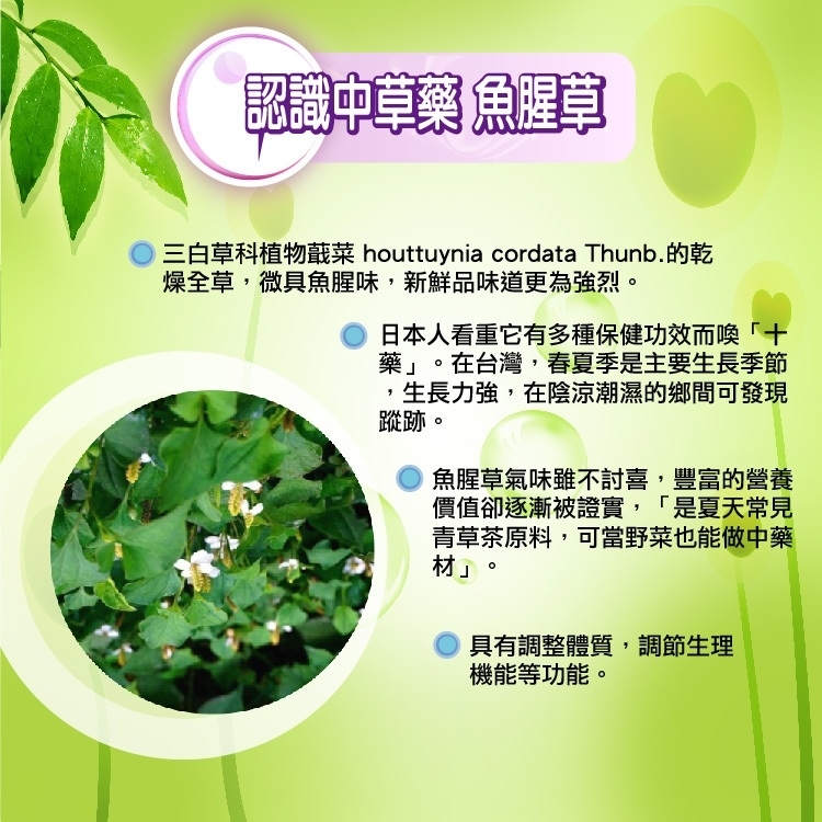 因為具有魚腥味而得名,氣味雖不討喜,但是豐富的營養價值卻逐漸被證實,是夏天常見青草茶原料,可當野菜也能做中藥材,具有調整體質,調節生理機能等功能。
