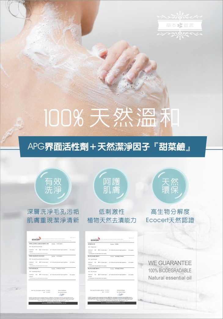 雙手淋濕後,取適量沐浴露於掌心,輕搓出泡沫塗抹按摩於頭皮,再以清水洗淨即可。