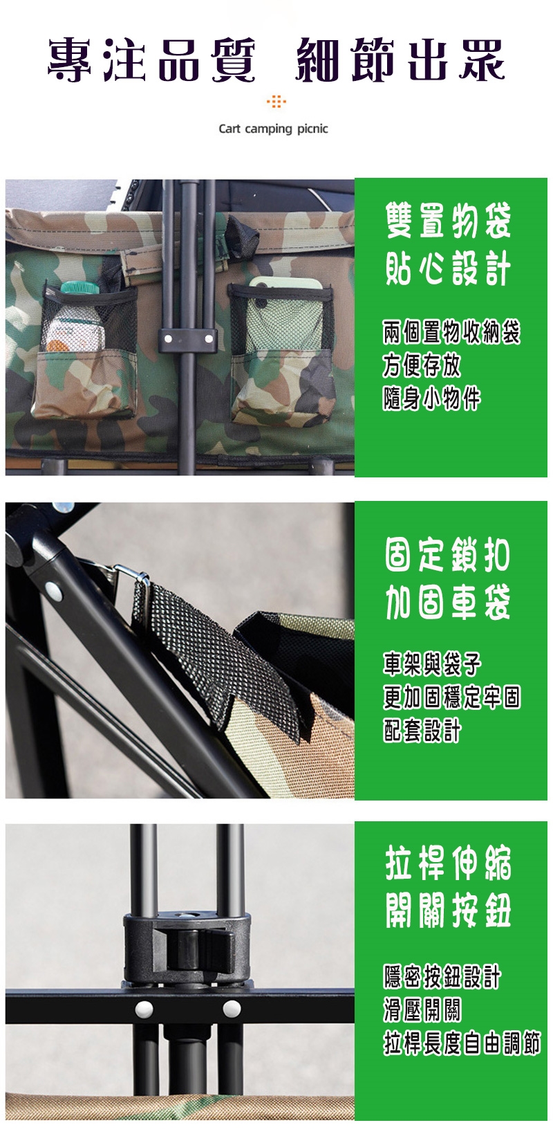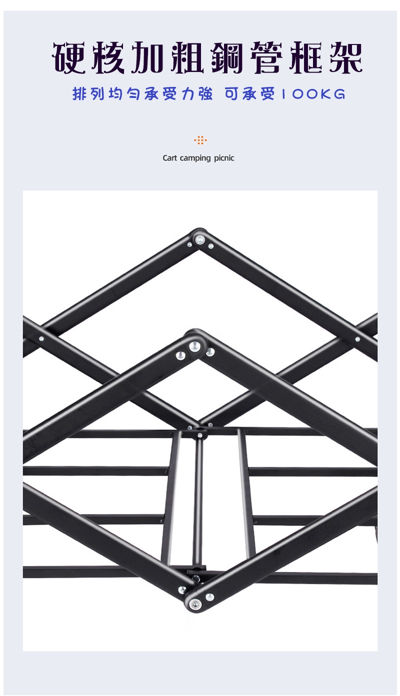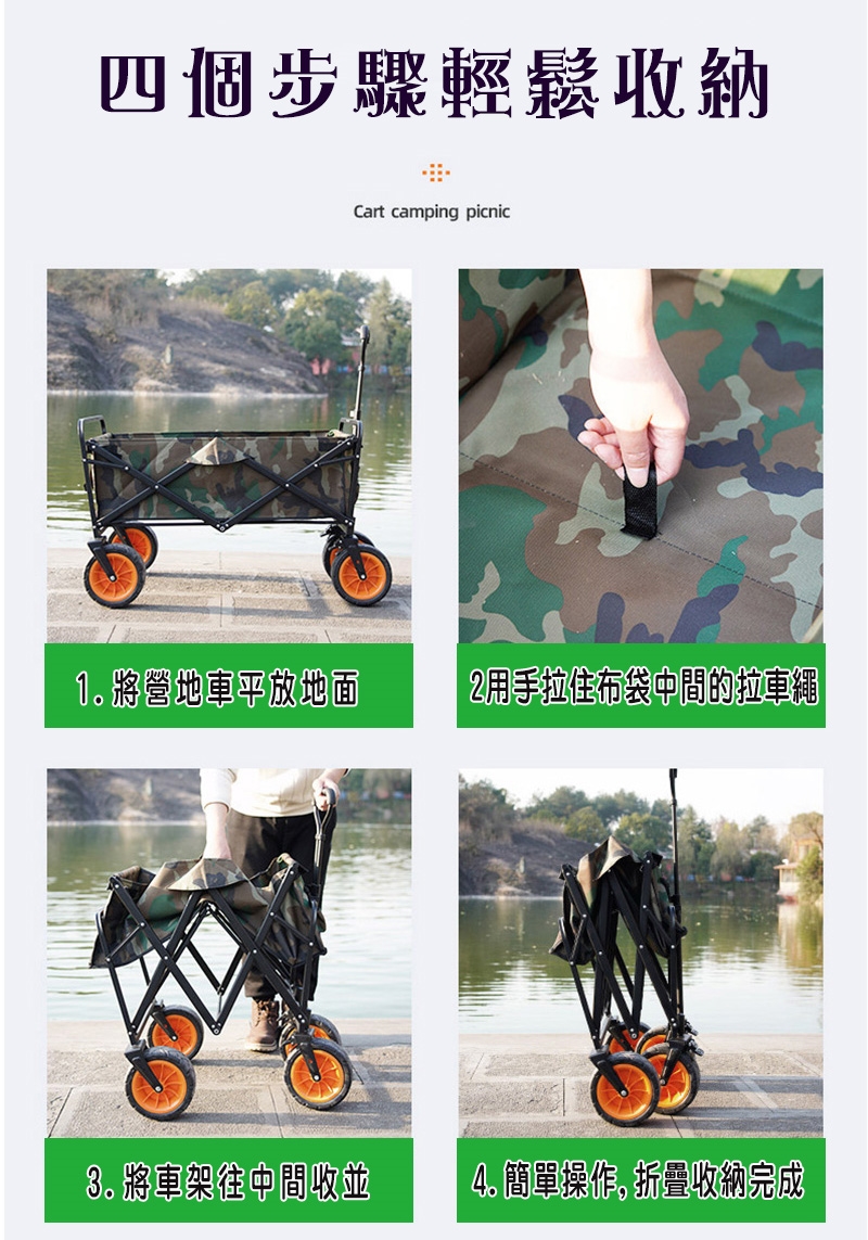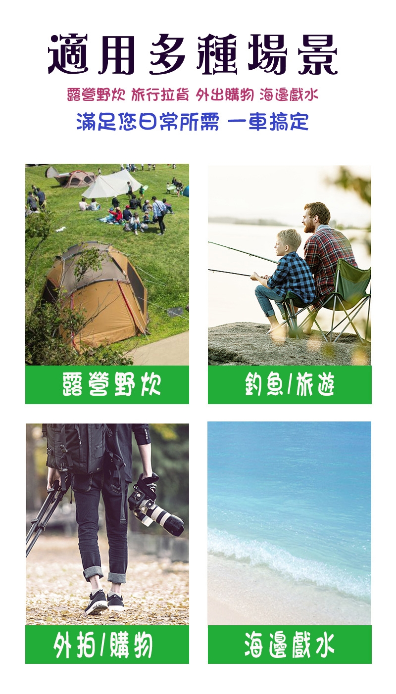 · 可全車身折疊,四個步驟輕鬆收納 · 幾秒鐘內輕鬆折疊和設置 · 前置收納袋X2,方便收納小物或放置水壺 · 重型鋼結構,堅固耐用 · 附同色系收納套子,方便攜帶 ·推車收合可拉著走,攜帶無負擔 |