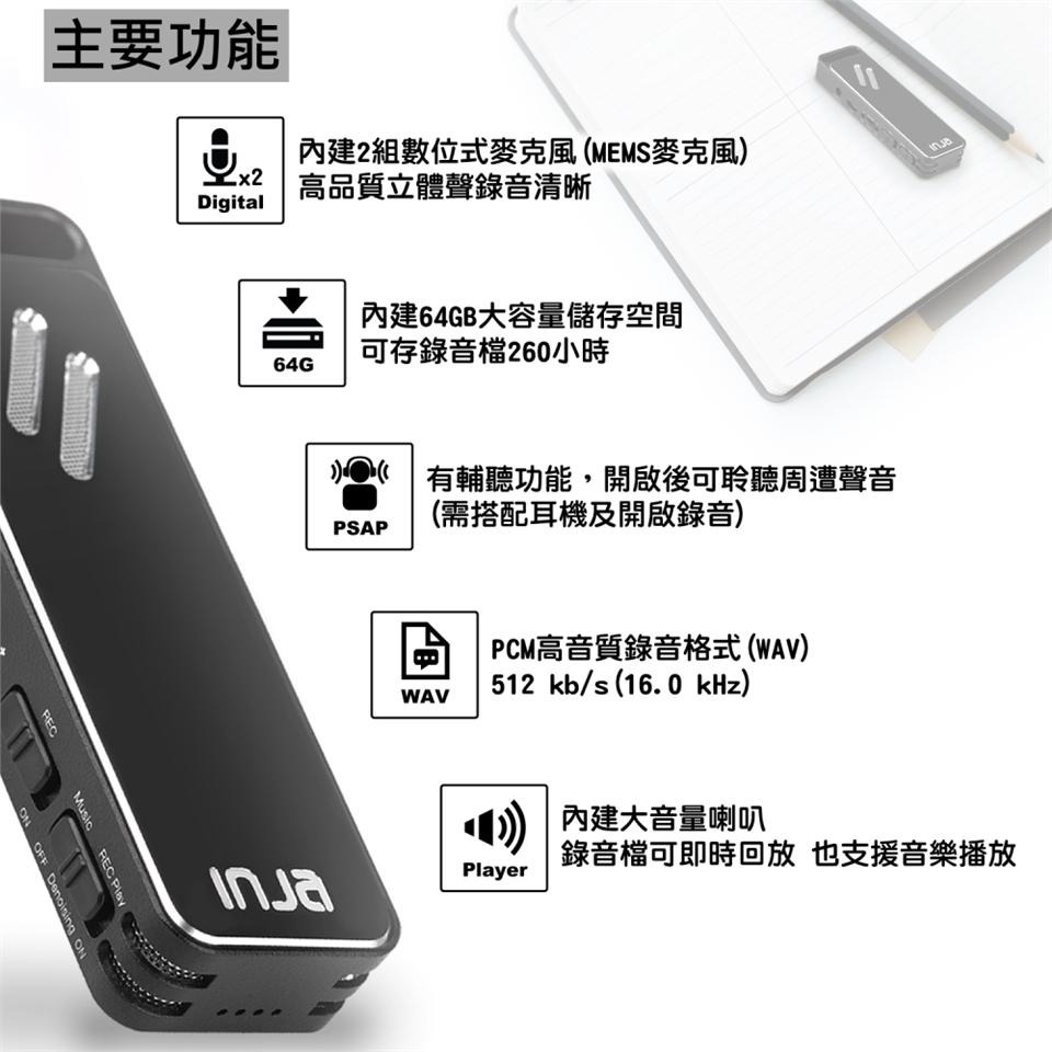 ●內建高品質立體聲雙麥克風,會議、講課、語音記事皆能清晰錄音