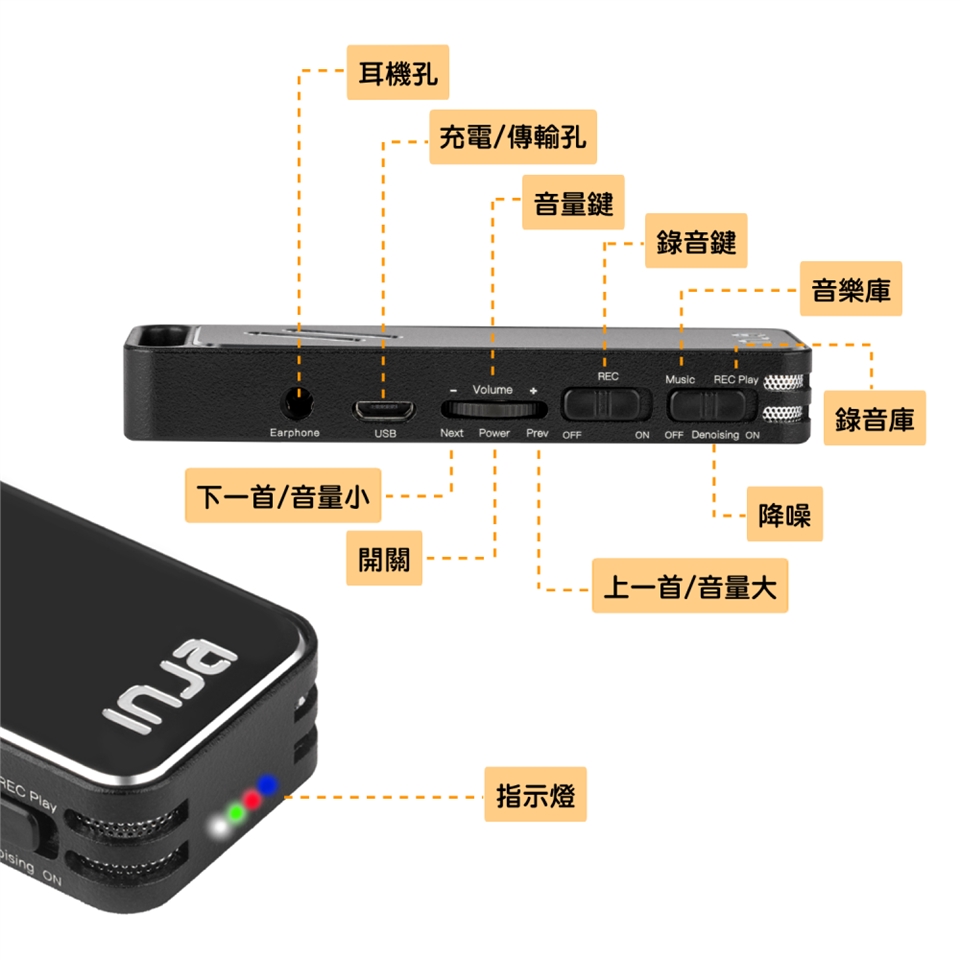 ●內建喇叭,強化音量,除了提供錄音檔回放,也支援音樂播放