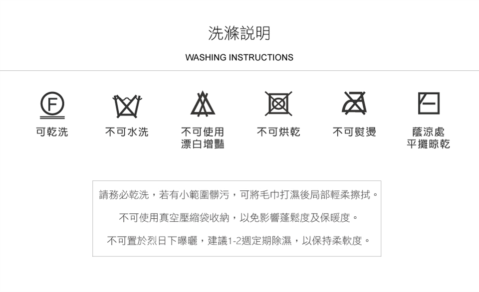 ► 請避免於太陽直射處曝曬,避免蠶絲纖維損壞。
