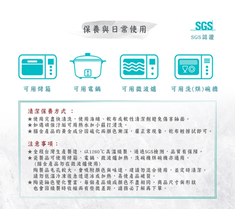 ■ 瓷製品可使用烤箱、電鍋、微波爐加熱,洗碗機烘碗機亦適用。